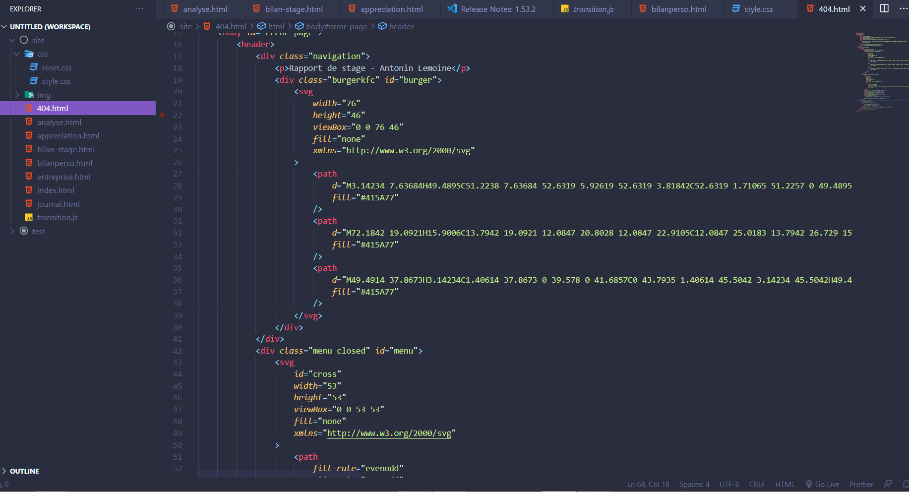 Vendredi c'est le dernier jour je devais donc tout finir aujourd'hui j'ai donc fait une check-list de ce qu'il me restait à faire c'est a dire : le menu burger, la page du bilan, la page appréciation, la pagination, le bouton retour sur à la page précédente et, la création et préparation du code pour introduire une image légendée et la page 404. J'ai réussi a trouver le temps de tout faire sauf le menu burger qui ce déplie avec une animation sauf que ce n'est pas possible à faire avec du HTML et du CSS mon tuteur a donc fait ce menu burger en essayant de m'expliquant le plus possible comment marche le JavaScript. C’était donc ma dernière journée à ce stage.