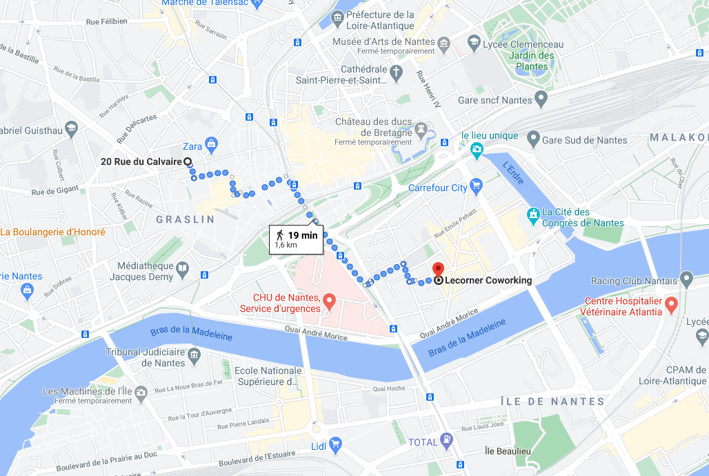 Capture d'écran du trajet à pied de l'appertement jusqu'à l'espace de coworking